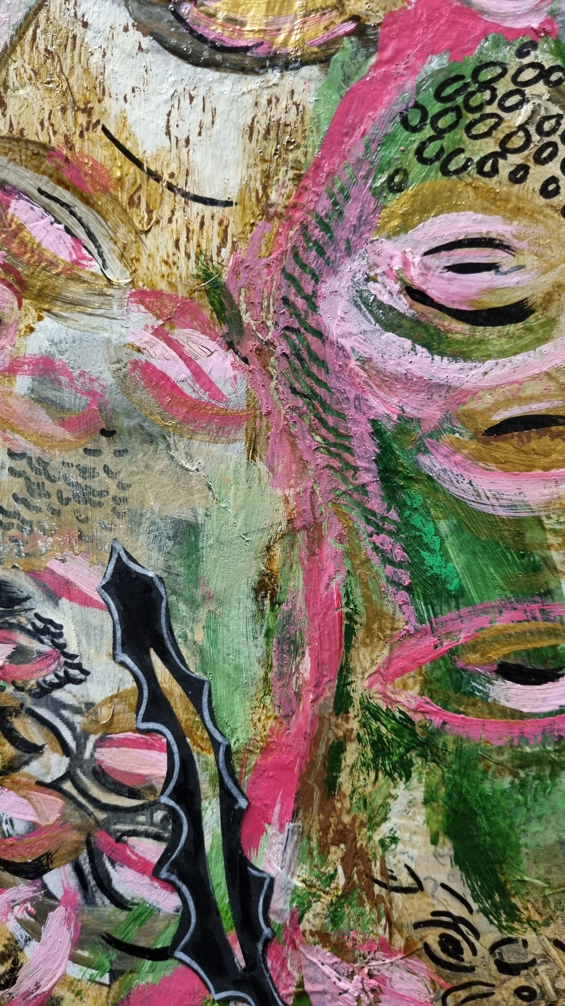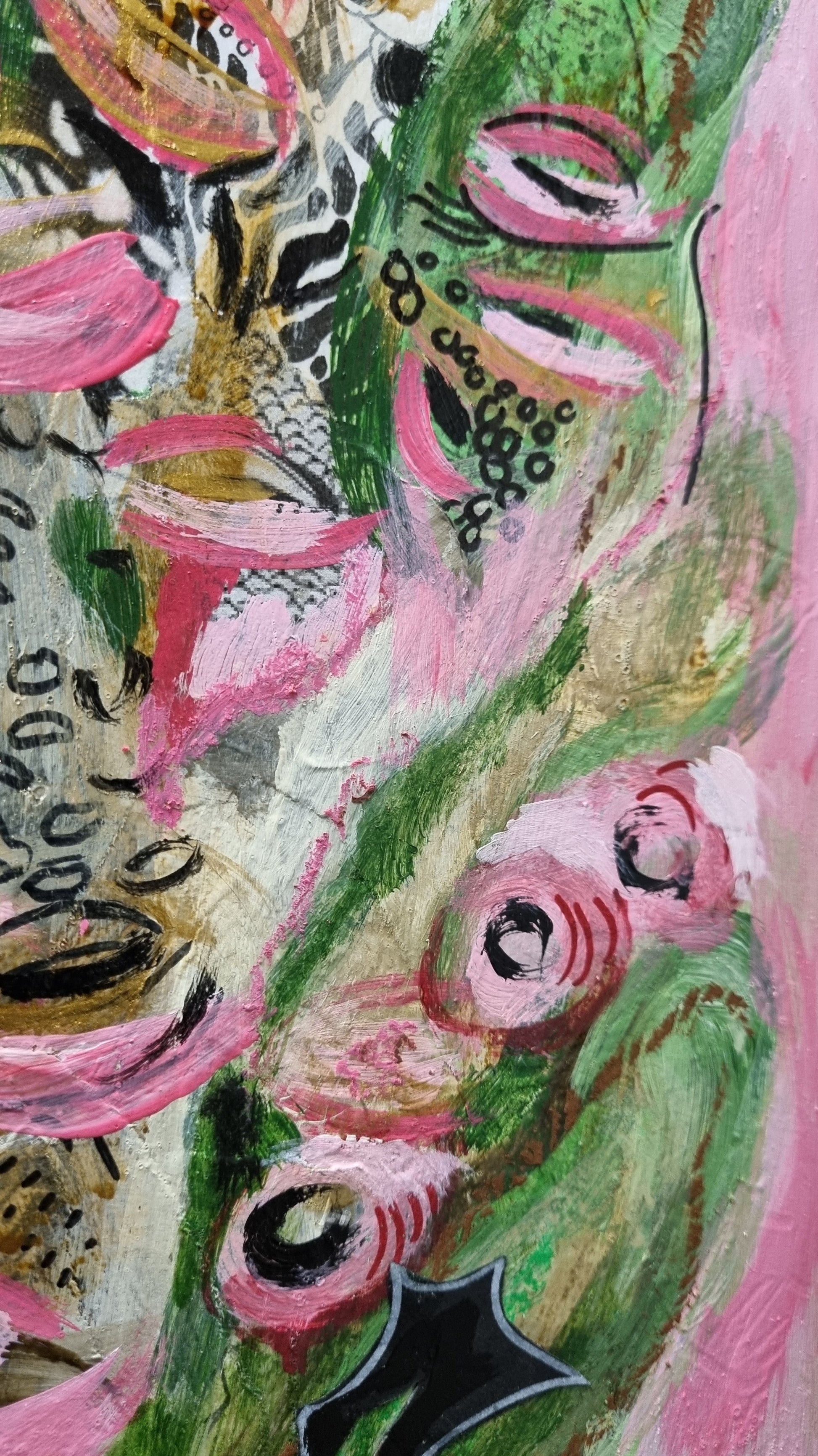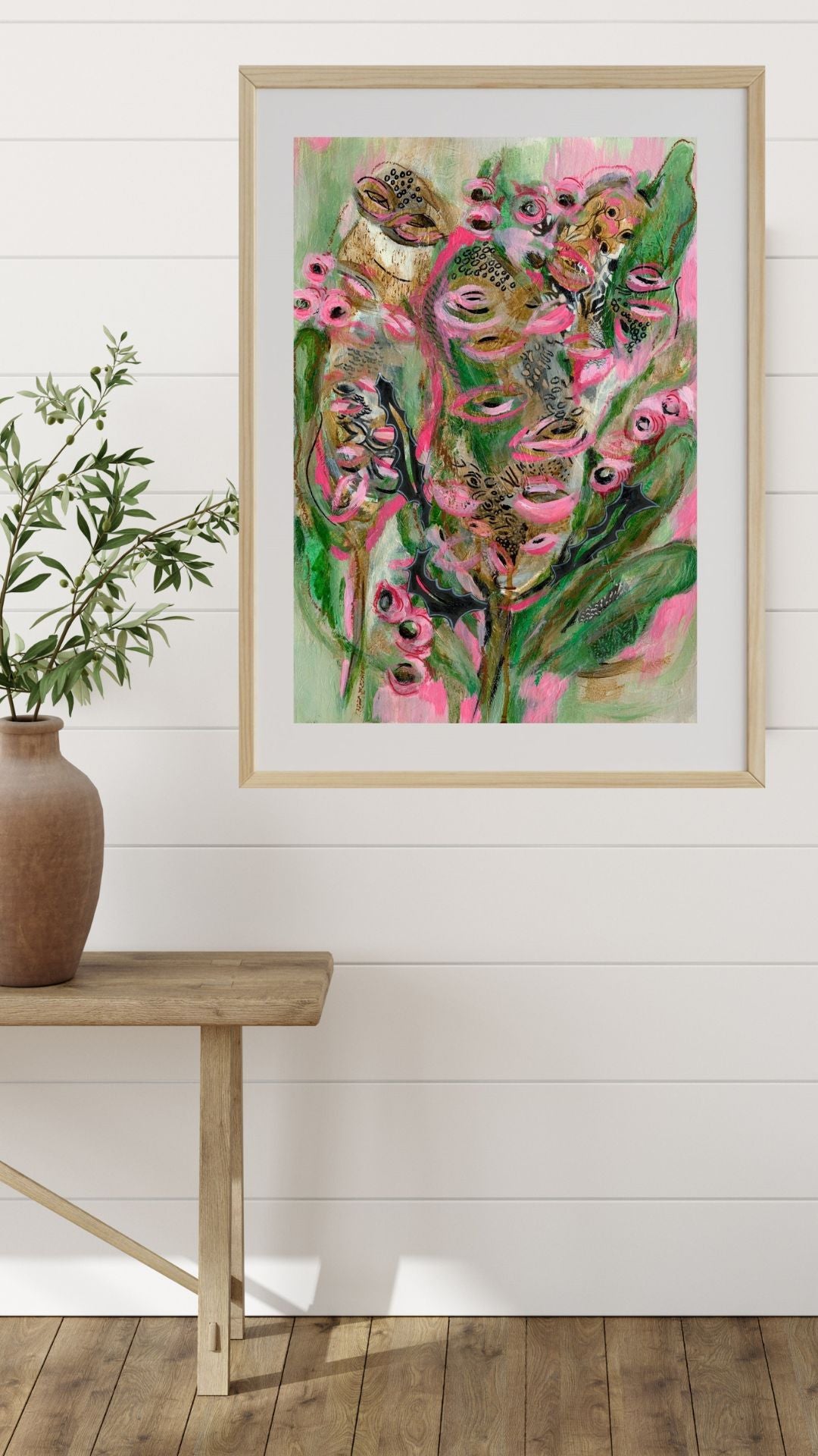 Banksia Symphony has the wow factor! It's a favorite piece of artwork for its rich and contemporary colour palette of hot pinks, sage greens, browns, blacks and touches of gold. Strong mark making, use of mixed media, line drawing and repeated pattern give it real drama yet still very joyful. This piece looks fabulous as an A2 wall art print in a floating timber raw oak frame!