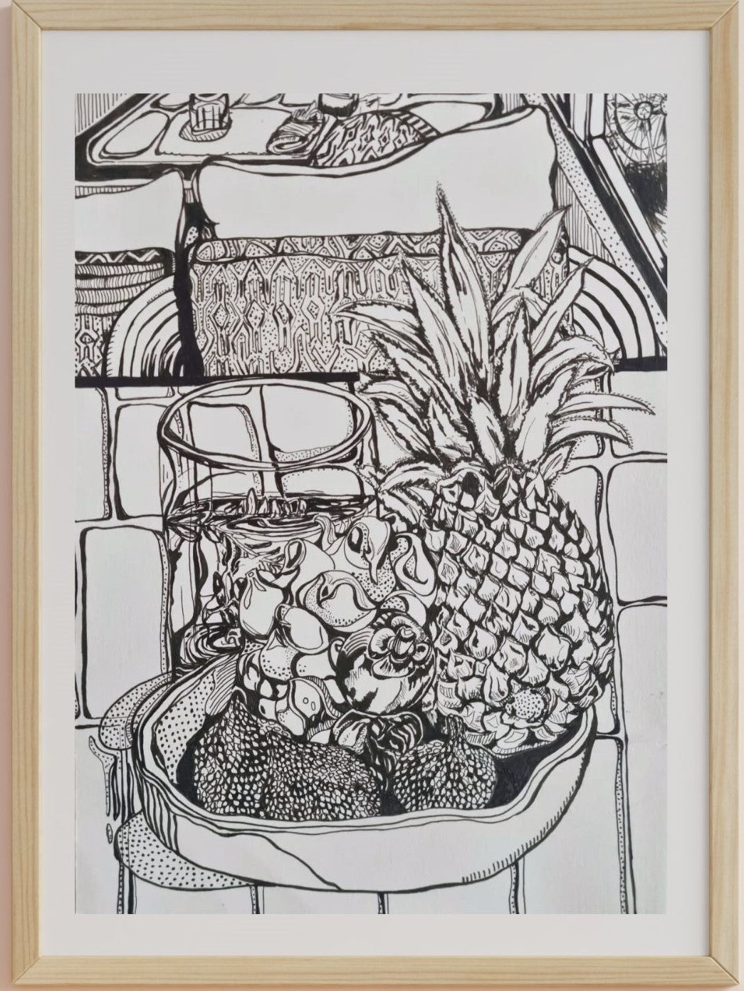Breakfast in Bali is an ink pen still life drawing from a week I spent stuck in Bali on the way home from Greece in 2025 as Cyclone Alfred was heading toward town. It was my first time ever in Bali. I wasn't really in a holiday frame of mind by this stage and so spent my time trying to relax, enjoying healthy food and the comfort of the hotel.